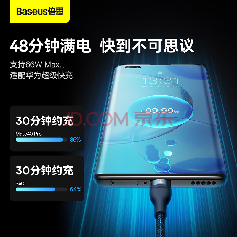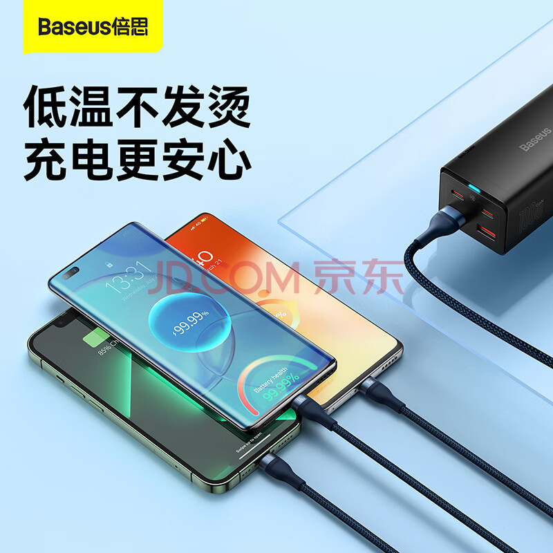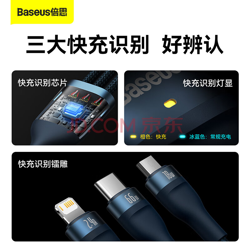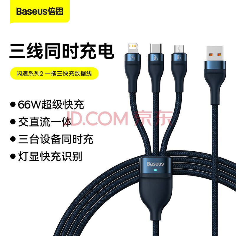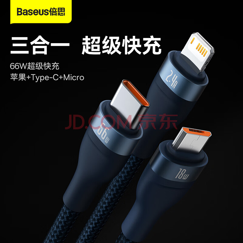 商品相册:倍思 数据线三合一 充电线66W/40W一拖三充电器线 适用iPhone15ProMax华为小米苹果手机平板车载线 蓝第