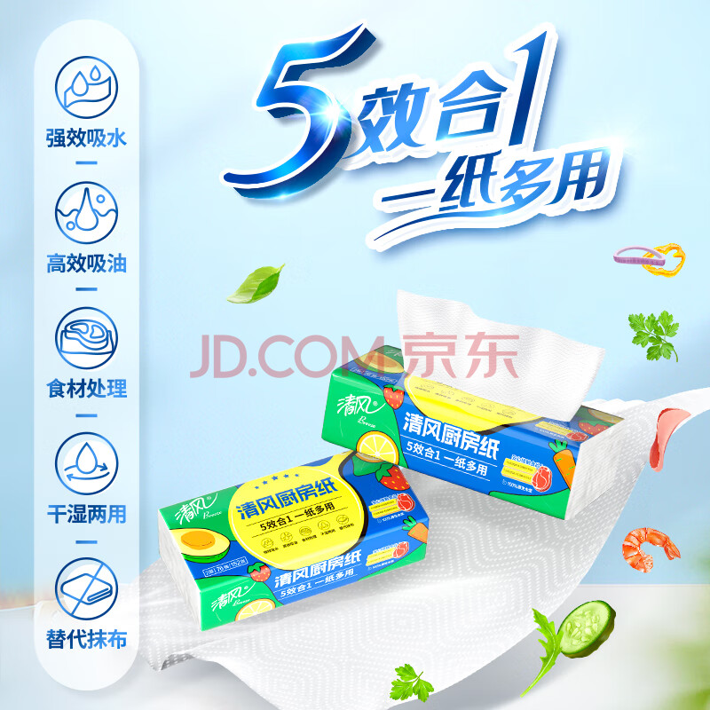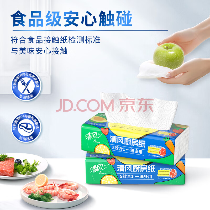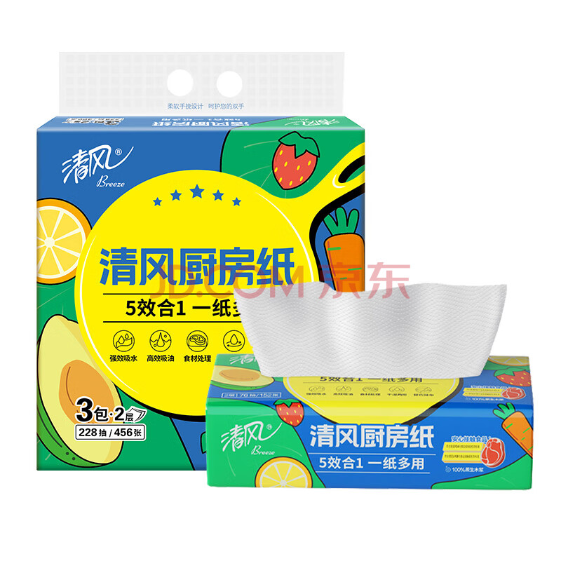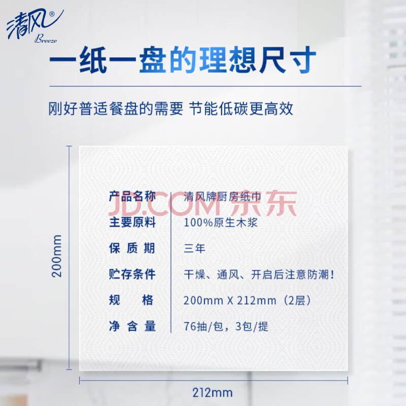商品相册:清风厨房抽纸76张*3包 加大加厚水油瞬吸 可接触食物级一次性懒人抹布第1张/共8