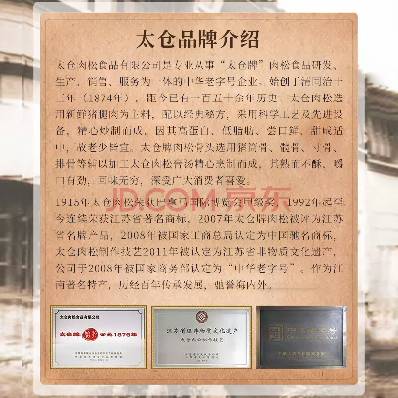 商品相册:太仓牌江苏特产太仓肉松即食下饭菜休闲零食 120g袋(内含12小袋)配粥第1张/共6