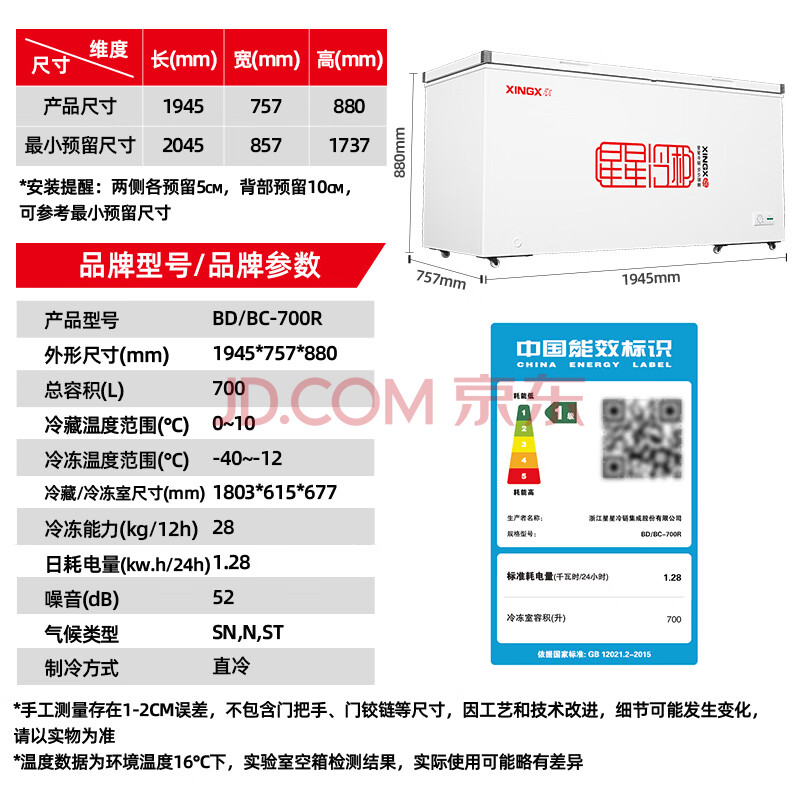 商品相册:星星(XINGX)700L商用冰柜冷柜 大容量冰箱冷藏冷冻保鲜节能顶开柜 减霜单箱卧式冷柜 BD/BC-700R 第