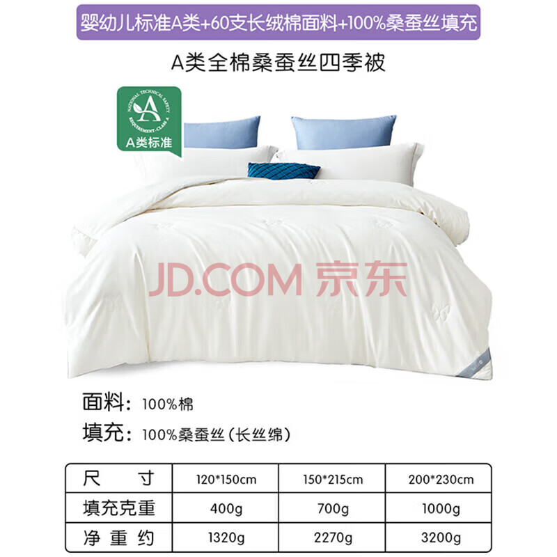 商品相册:罗莱儿童蚕丝被子 母婴A类全棉桑蚕丝四季被 幼儿园单人被芯150*215第