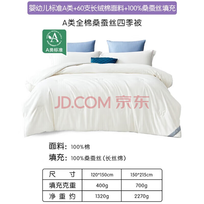 商品相册:罗莱儿童蚕丝被子 母婴A类全棉100%桑蚕丝四季被芯 200*230第