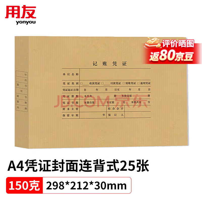 商品相册:用友表单A4凭证封面连背一体式带脊背 150g加厚木浆 298*212*30mm 25张/包 配套a4用友记账凭证纸 DX01036第