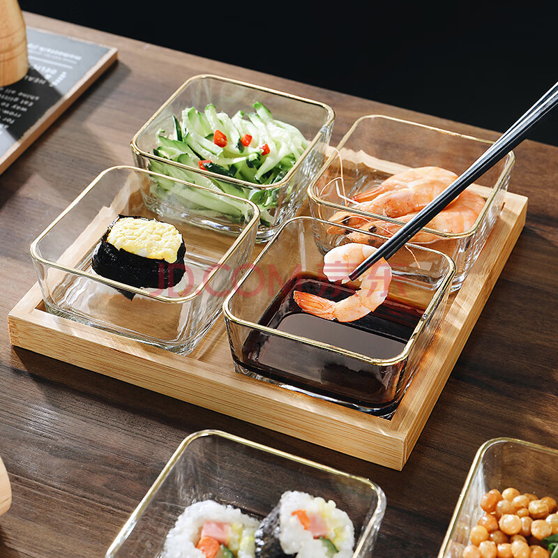 商品相册:格娜斯分格蘸料碟小吃拼盘家用菜碟火锅酱料碟调味碟油碟醋碟带托盘 金边玻璃碗6个+六格竹盘第