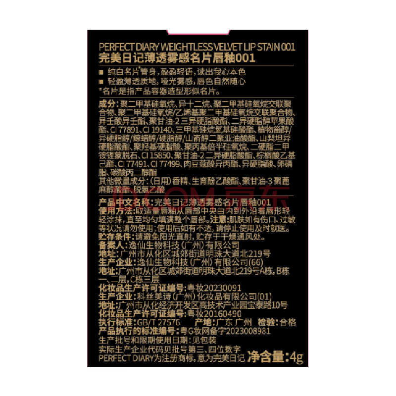 商品相册:完美日记薄透雾感名片唇釉001裸粉色4g丝绒口红显白生日礼物送女友第