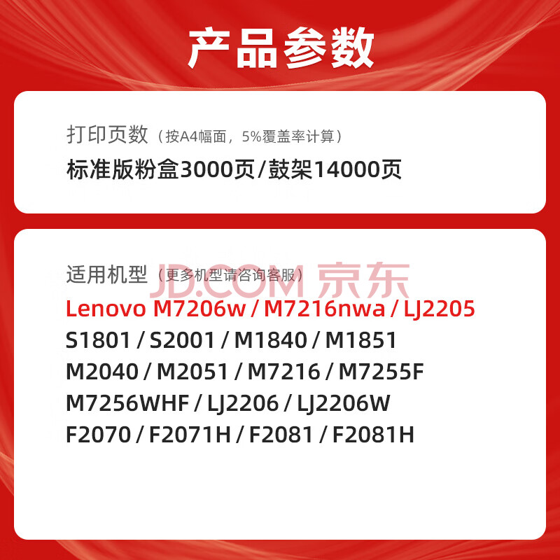 商品相册:玖六零LT201粉盒适用联想M7206硒鼓M7206W墨盒LJ2205 2206W M7256whf墨粉盒S1801 M1851 F2081 m7216nwa打印机硒鼓第