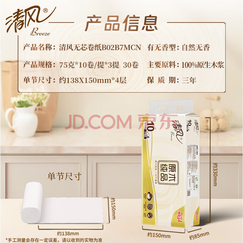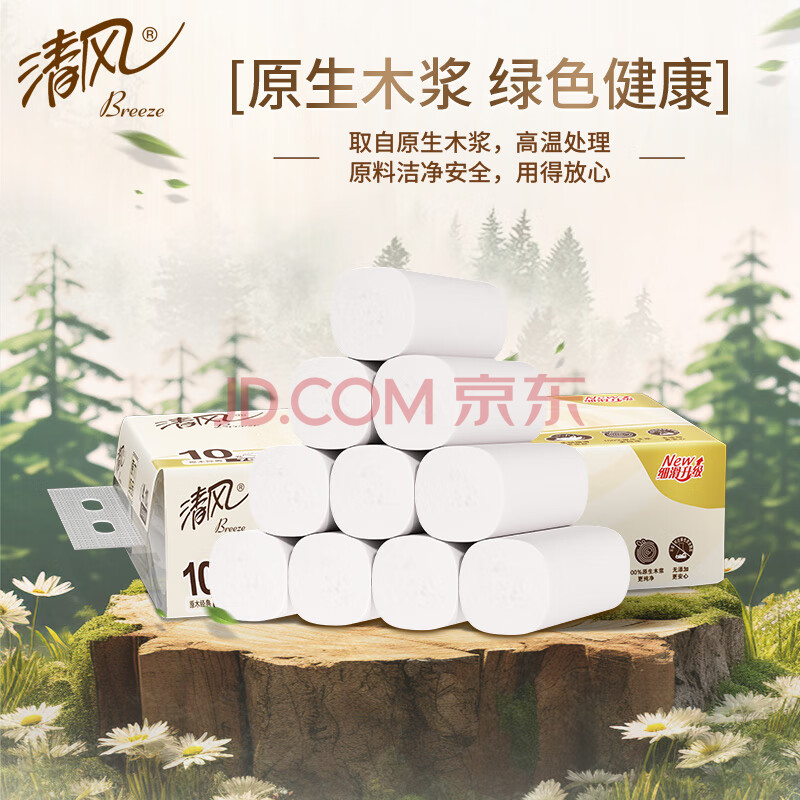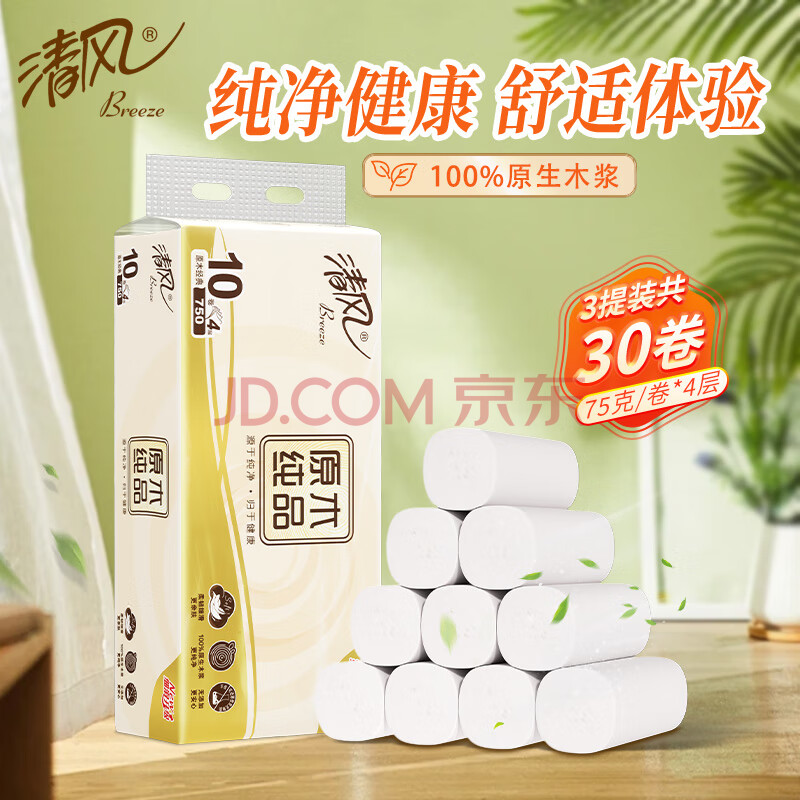 商品相册:清风无芯卷纸 原木纯品 4层加厚2250克/30卷卫生纸家用厕纸妇婴用纸第