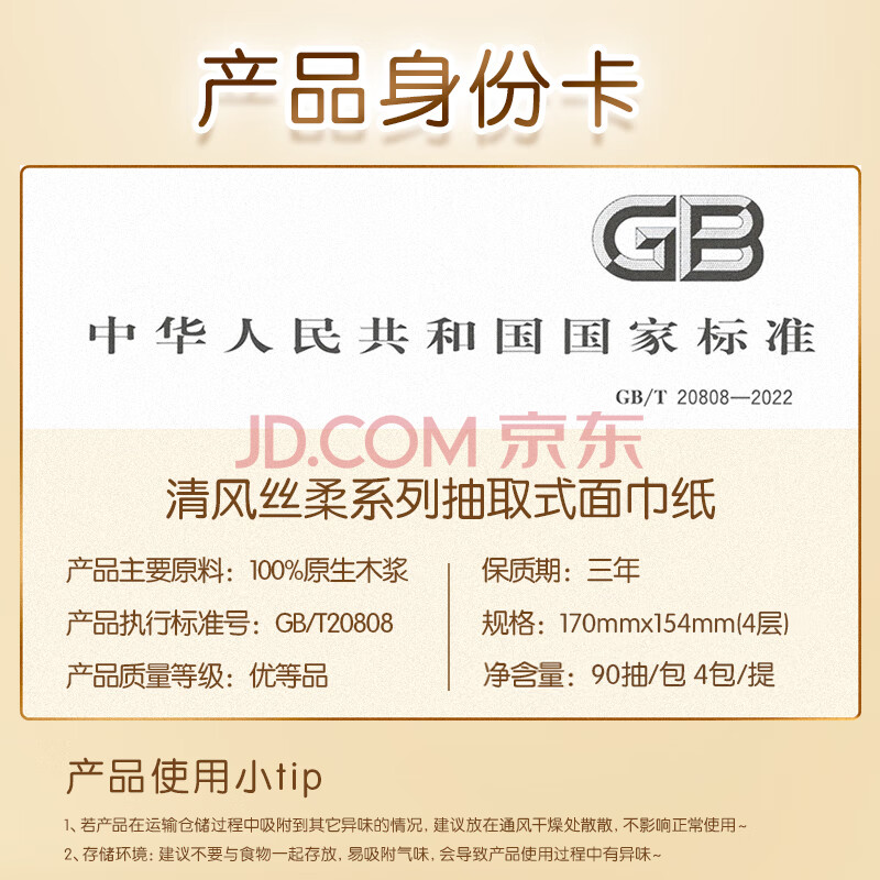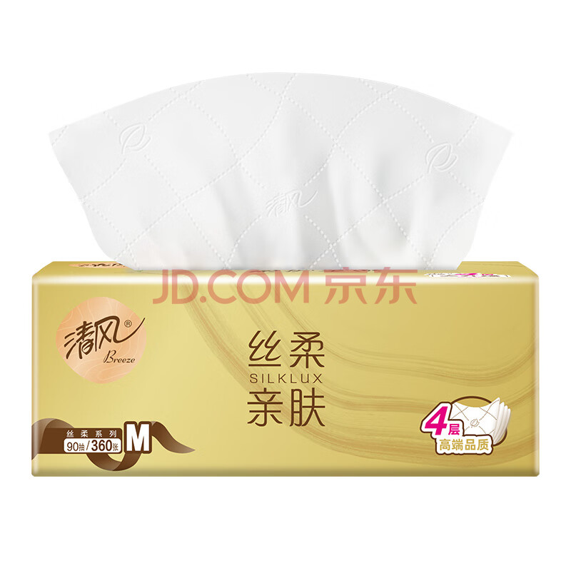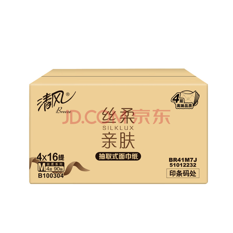 商品相册:清风BR41M7J丝柔金装90抽4层M码餐巾纸面巾纸抽纸整箱16提64包箱装第