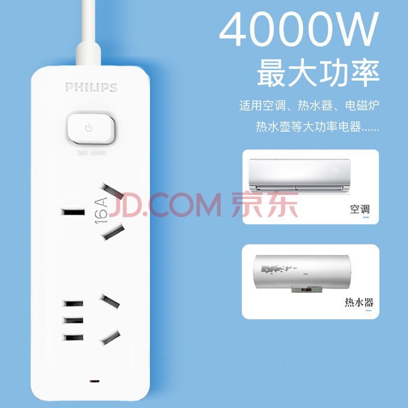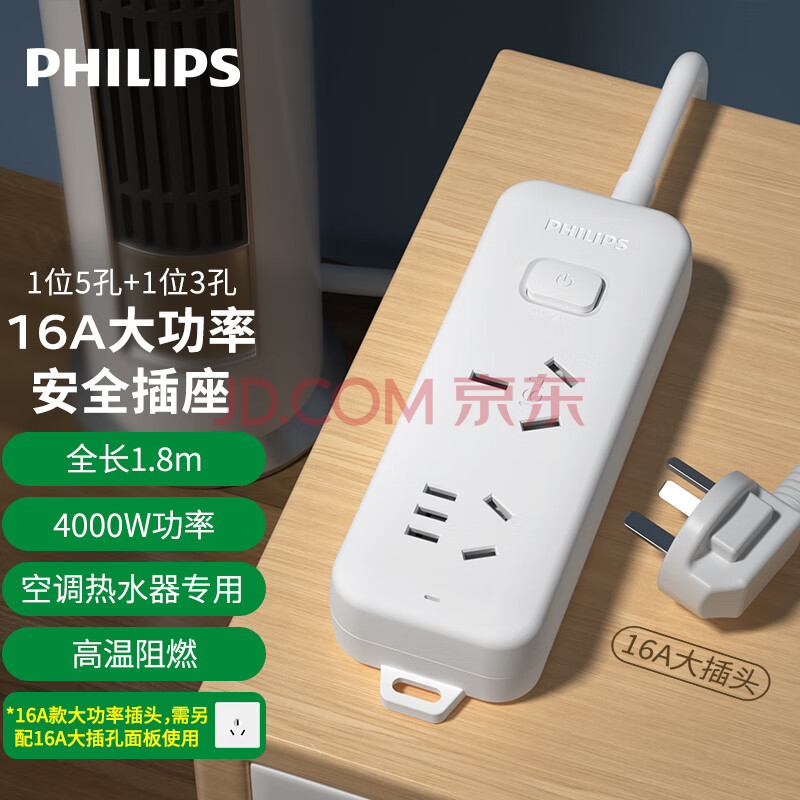 商品相册:飞利浦(PHILIPS)16A大功率插座 2孔位1.8米 4000W空调/热水器专用 插排/插线板/排插/接线板/拖线板第