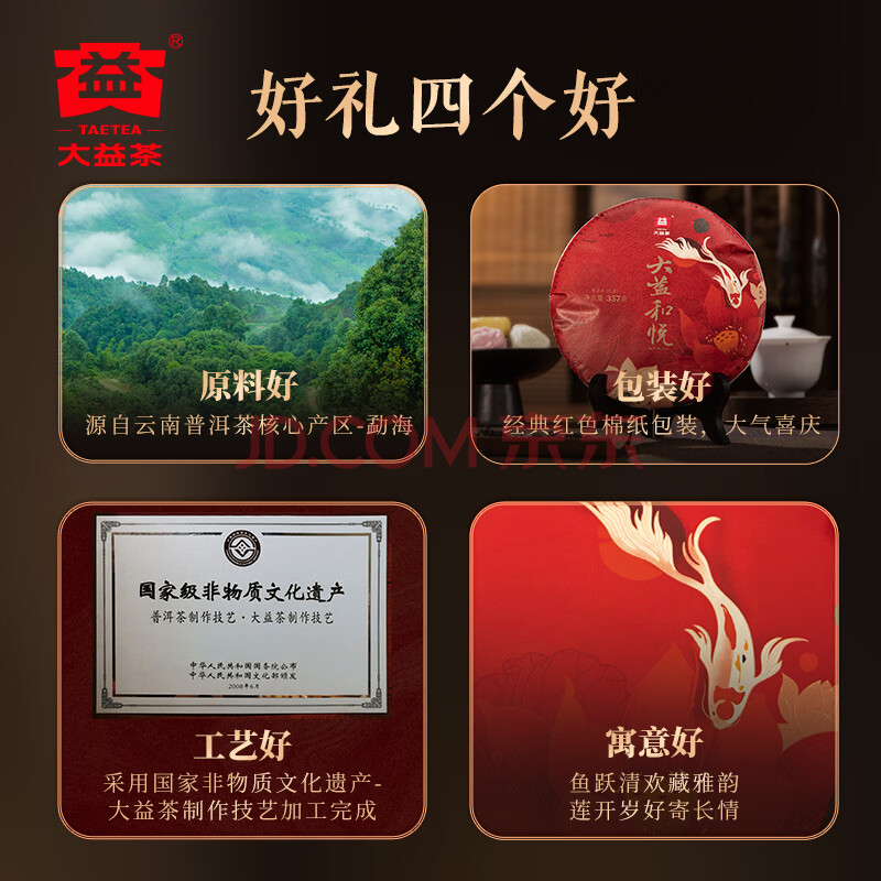 商品相册:大益TAETEA茶叶普洱茶茶饼 4年陈 和悦普洱生茶357g/饼 送礼茶叶礼盒第