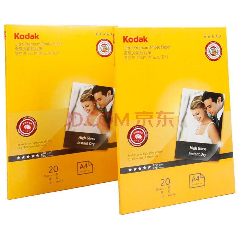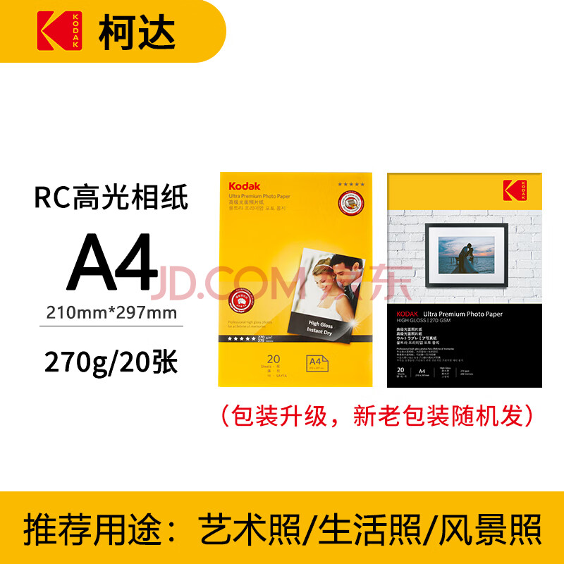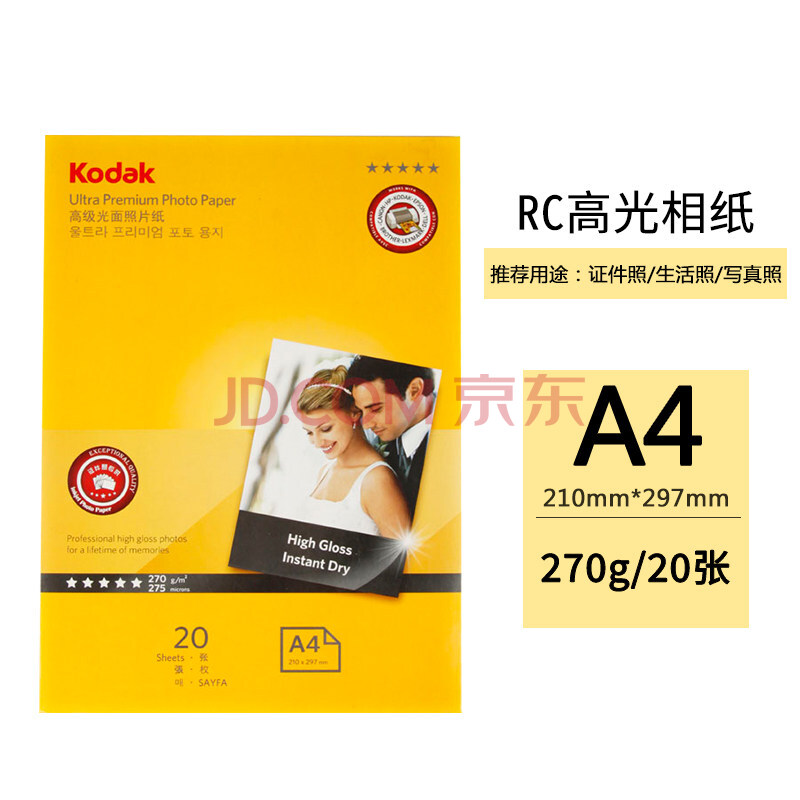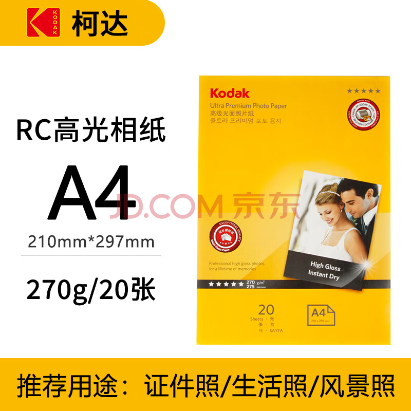 商品相册:KODAK柯达 A4 270g防水RC高光面照片纸/喷墨打印相片纸/相纸 20张装 5740-329第