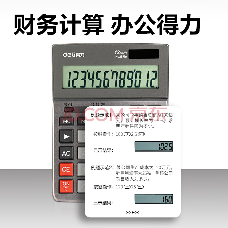 商品相册:得力(deli)双电源商务办公桌面计算器 12位大屏塑胶按键桌面计算机 1671A第