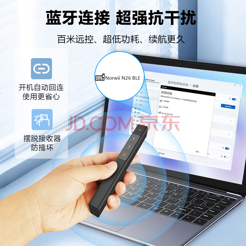 商品相册:诺为360度蓝牙控制激光翻页笔教师专用100米距离远控PPT 无线演示器投影笔逗猫电子笔N26 BLE红光黑色第