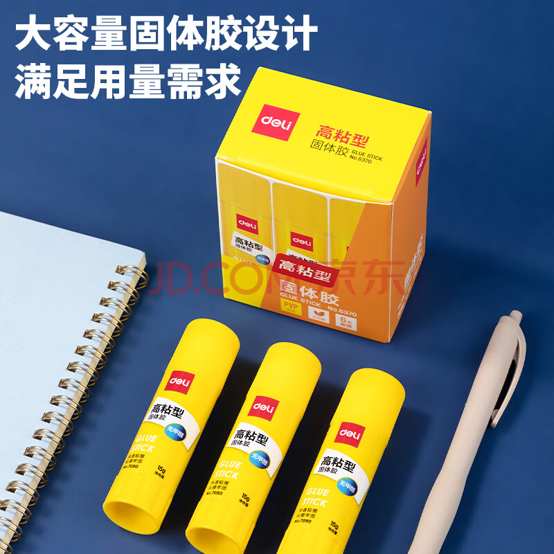 商品相册:得力(deli)15g高粘度PVP固体胶水 无甲醛快干耐用胶棒 强力粘接 学生文具 6支装 办公用品 6370第