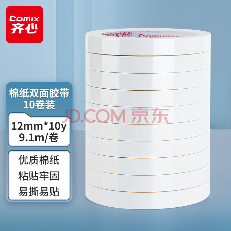 商品相册:齐心(COMIX)高粘性棉纸双面胶强力高粘度12mm*10y(9.1m/卷)10卷装 开学必备学生文具/办公用品 白色MJ1210-10第