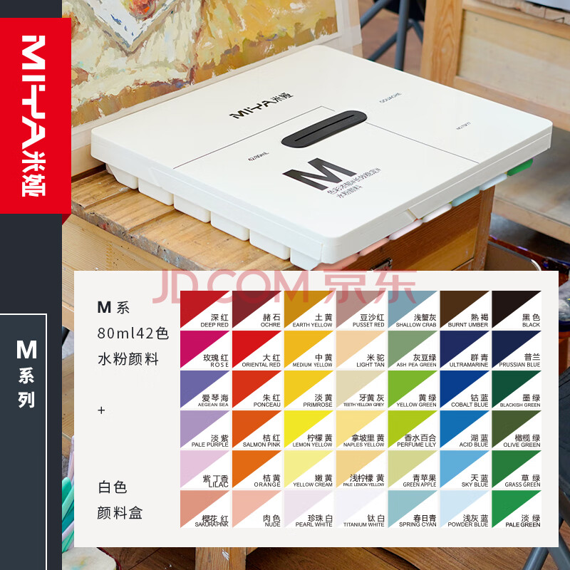 商品相册:米娅颜料水粉颜料果冻颜料工具套装美术生艺考生专用画画水彩水粉画色彩M系80ml42色限定款美术写生第1张/共3