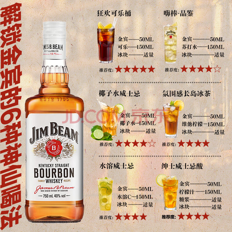 商品相册:金宾(Jim Beam)白占边调和型 波本美国肯塔基州 威士忌洋酒 750ml第