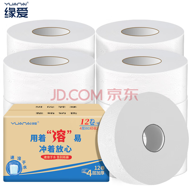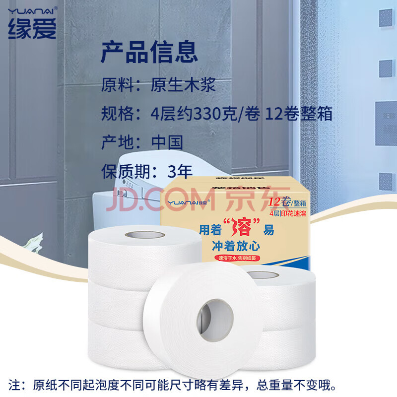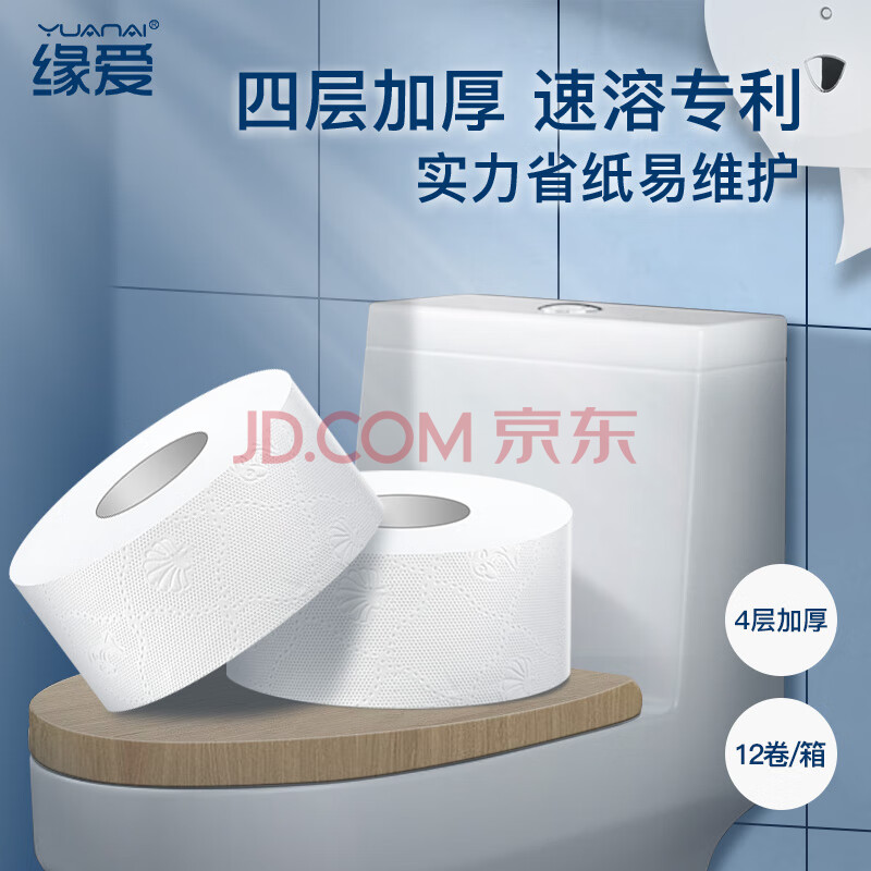 商品相册:缘爱大卷纸商用4层330克*12卷厕所酒店专用有芯大盘纸卫生纸厕纸整箱第