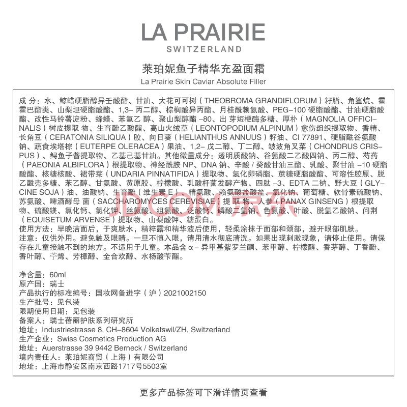 商品相册:莱珀妮(La Prairie)鱼子充盈面霜60ml护肤品礼盒滋润补水保湿紧致提升生日礼物送女友第