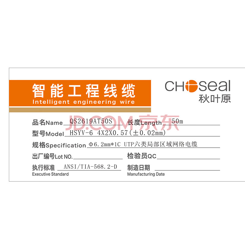 商品相册:秋叶原(CHOSEAL)六类千兆网线【0.57±0.02mm】CAT6类纯铜线芯 非屏蔽工程家装电脑网络监控布线箱线 50米 QS2619A第