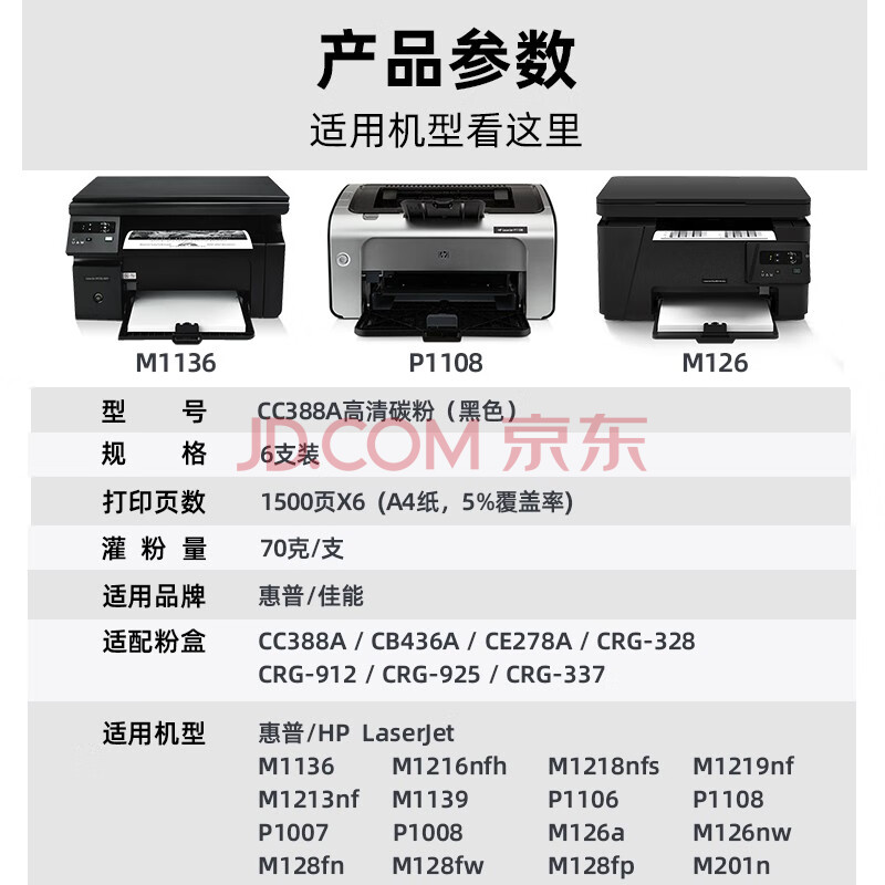 商品相册:V4INK CC388A碳粉88A墨粉6支(适用惠普HP打印机硒鼓388a碳粉m1136墨盒)第