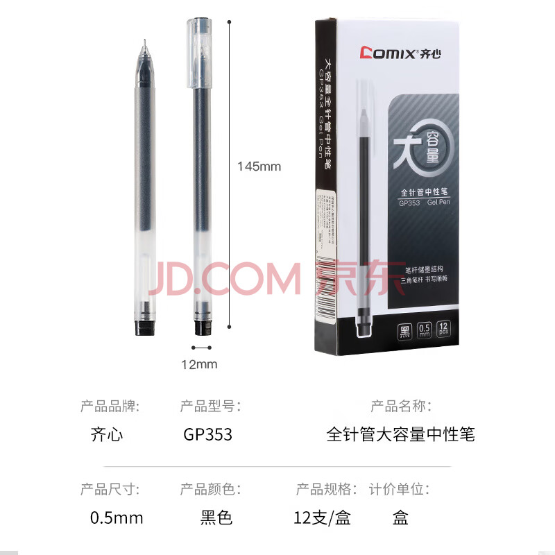 商品相册:齐心(Comix)巨能写大容量中性笔签字笔水笔考试办公会议笔0.5mm 12支/盒 GP353 黑色第