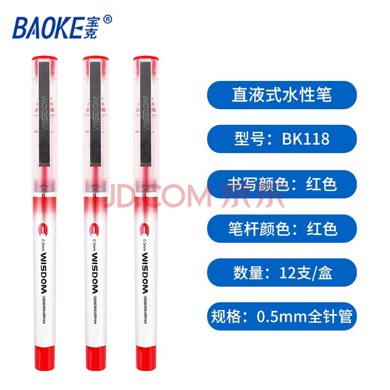 商品相册:宝克(BAOKE)BK118 品质直液式走珠笔全针管0.5mm中性笔 学生用水笔签字笔 红色 12支/盒第
