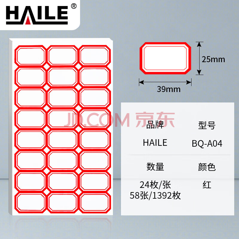 商品相册:HAILE不干胶标签纸姓名贴39*25mm口取纸 24枚/张 58张/包BQ-A04第