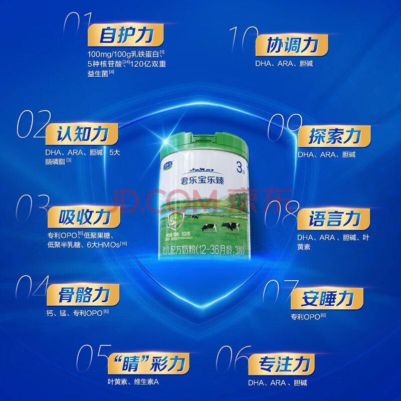 商品相册:君乐宝乐臻3段幼儿配方奶粉(12-36月龄)800g*6罐含OPO+乳铁蛋白第1张/共8