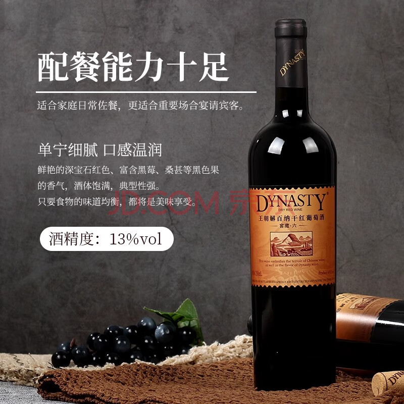 商品相册:王朝(DYNASTY)窖藏六解百纳干红葡萄酒750ml*6瓶整箱红酒第