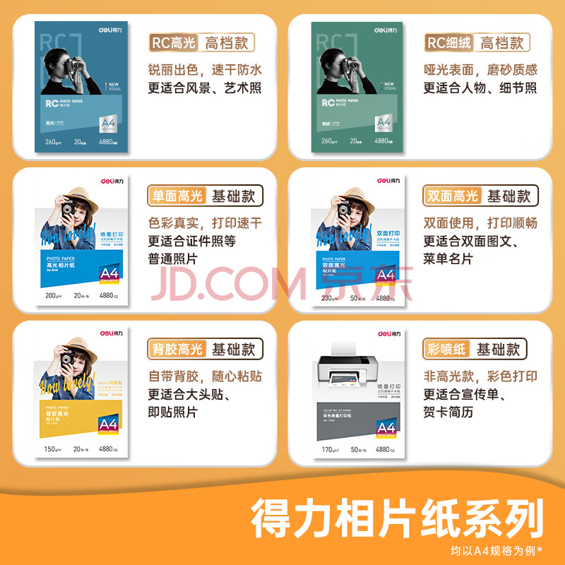 商品相册:得力(deli)A4 230g双面高光照片纸 相片打印纸 50张/盒 11826第