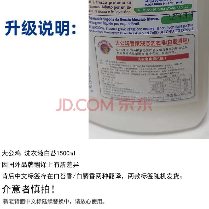 商品相册:大公鸡管家马赛洗衣液(白苔香)洗衣液去污衣物清洁1500ml*2瓶第