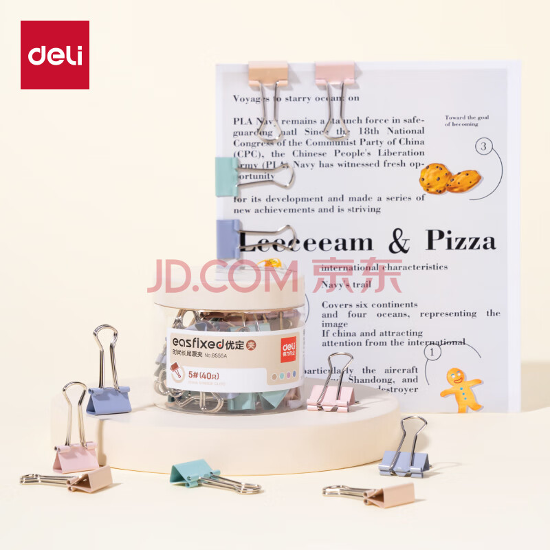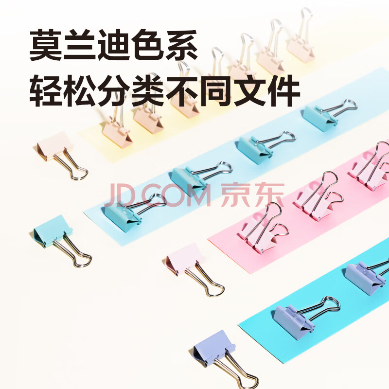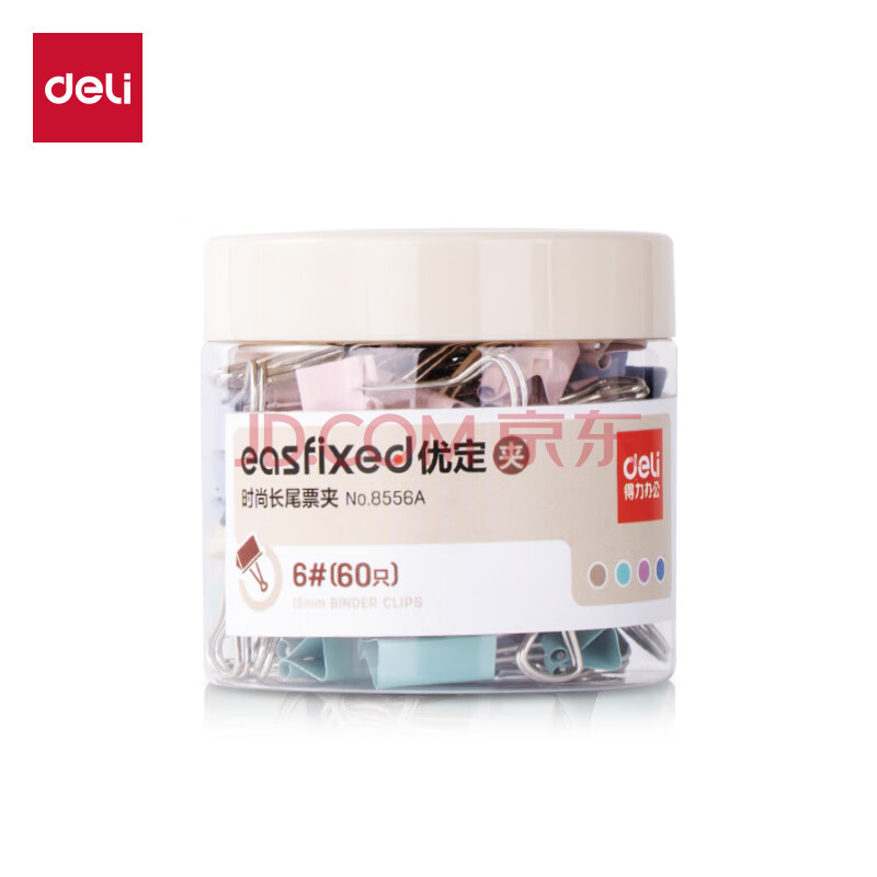 商品相册:得力(deli)60只15mm小号莫兰迪色时尚长尾票夹 金属燕尾夹 升级新配色 60只/筒 8556A第