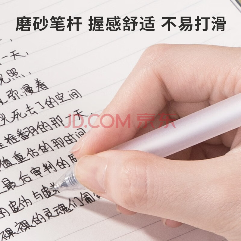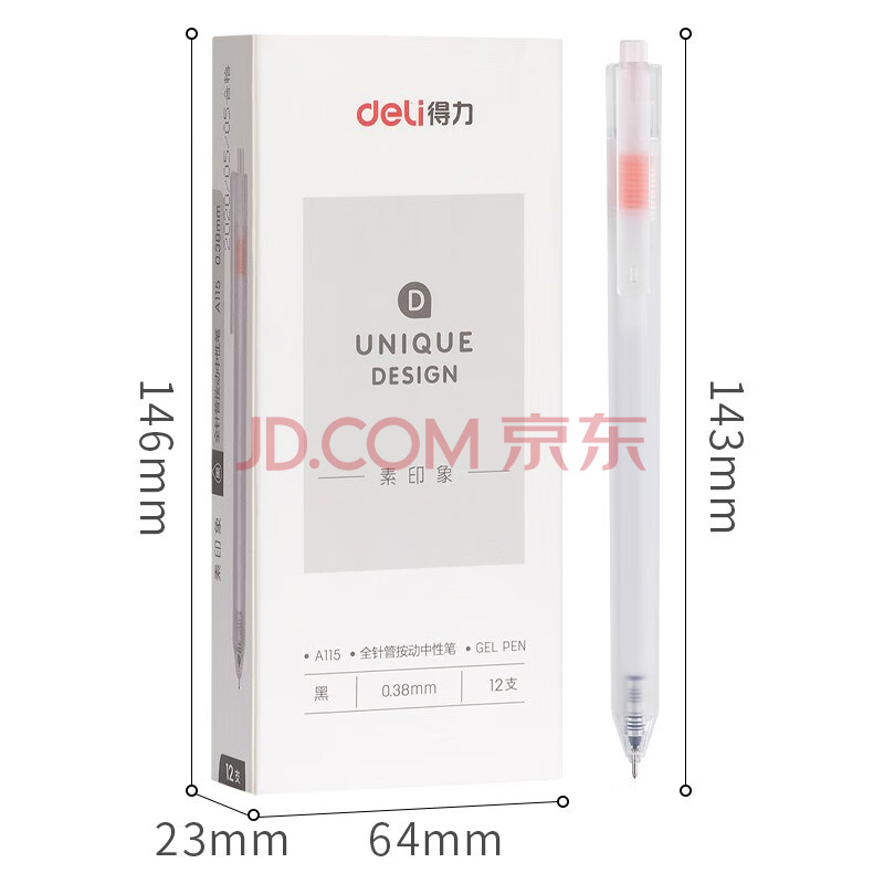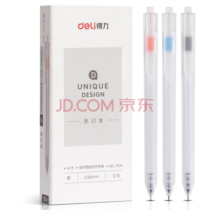 商品相册:得力(deli)雾透按动中性笔签字笔 0.38mm全针管简约无印风按动笔水笔 黑色 12支/盒DL-A115第