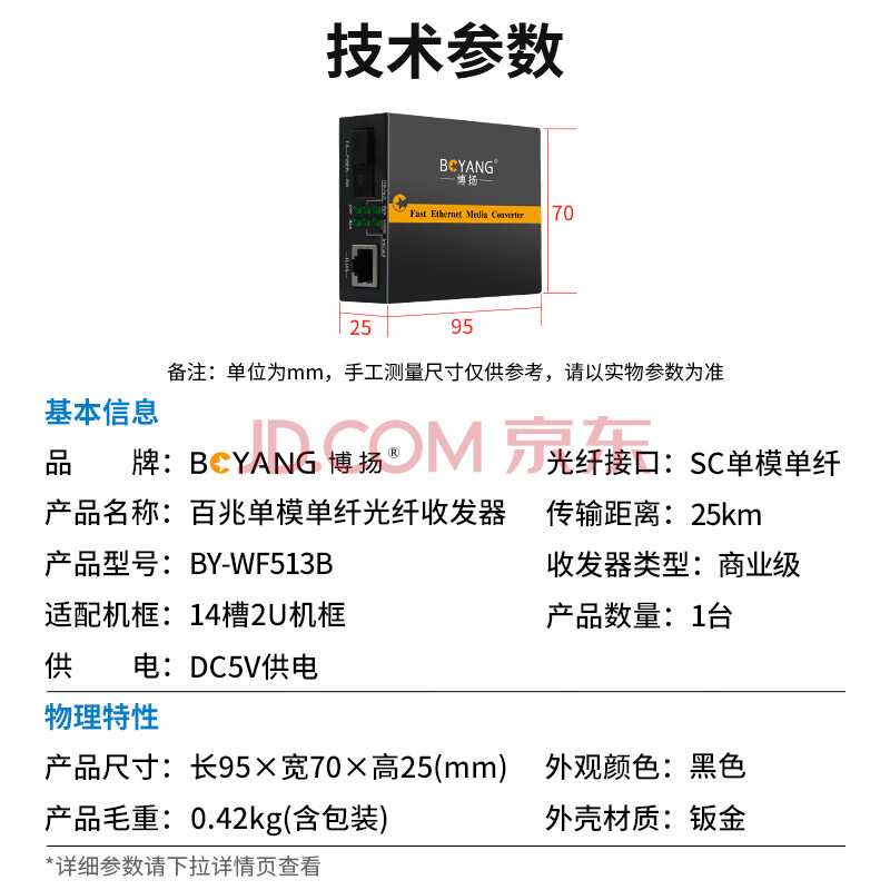 商品相册:博扬(BOYANG)百兆单纤单模光纤收发器 光电转换器 防雷SC接口 25公里外置电源一台光收发器B端BY-WF513B第