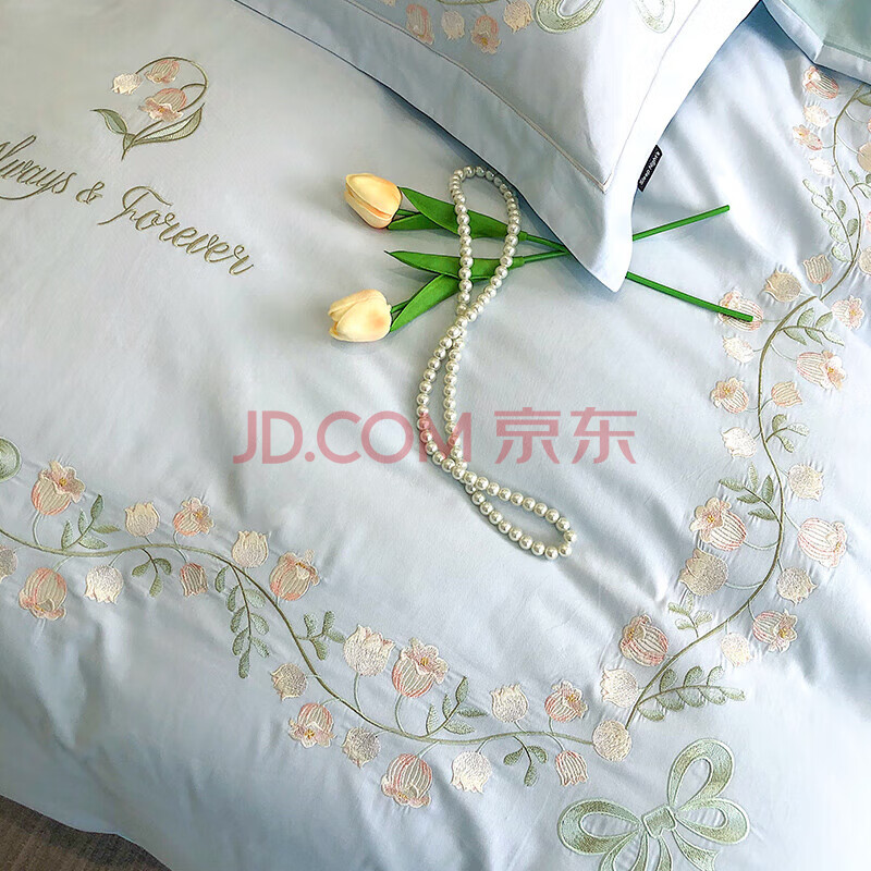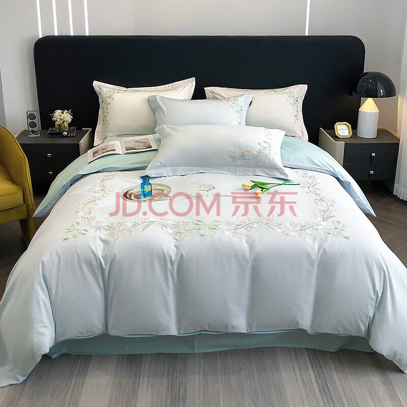 商品相册:Demichel 60支刺绣长绒棉四件套纯棉 法式高端全棉床上被套床单 1.8/2米床 铃兰蓝第