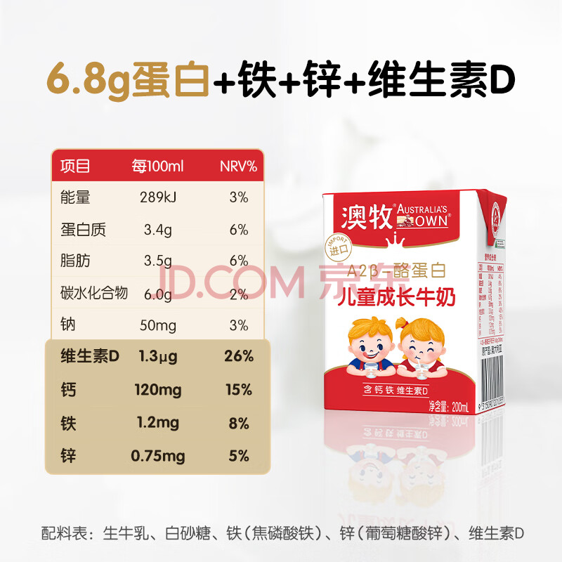 商品相册:澳牧(Australia's Own)儿童成长牛奶A2蛋白铁锌VD宝宝学生全脂早餐奶200ml*30盒过年囤货第