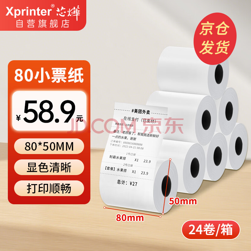 商品相册:芯烨(XINYE)80热敏收银纸 京东美团外卖80*50mm小票打印纸 商超餐饮收银小票纸后厨票据热敏纸24卷(约17米/卷)第