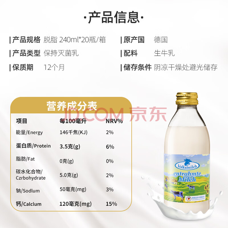 商品相册:德质Volksmilch脱脂牛奶整箱240ml*20瓶进口牛奶0脂肪0蔗糖高钙纯牛奶第