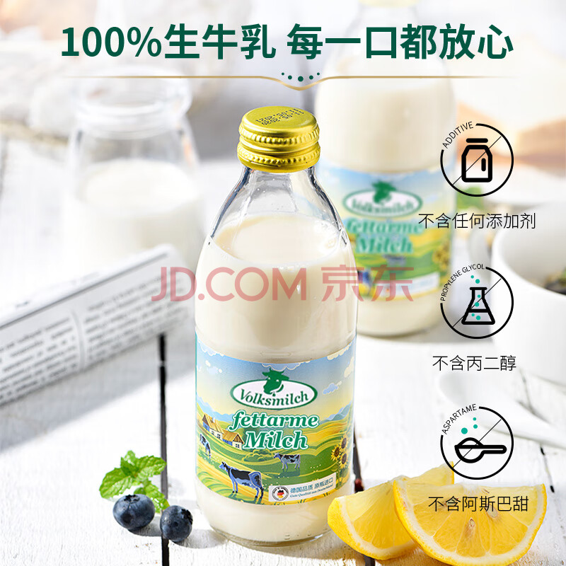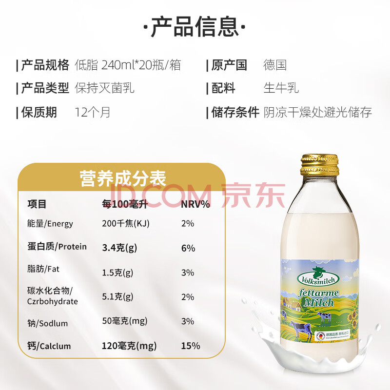 商品相册:德质Volksmilch低脂牛奶240ml*20瓶整箱进口牛奶 0蔗糖高钙低脂纯牛奶第