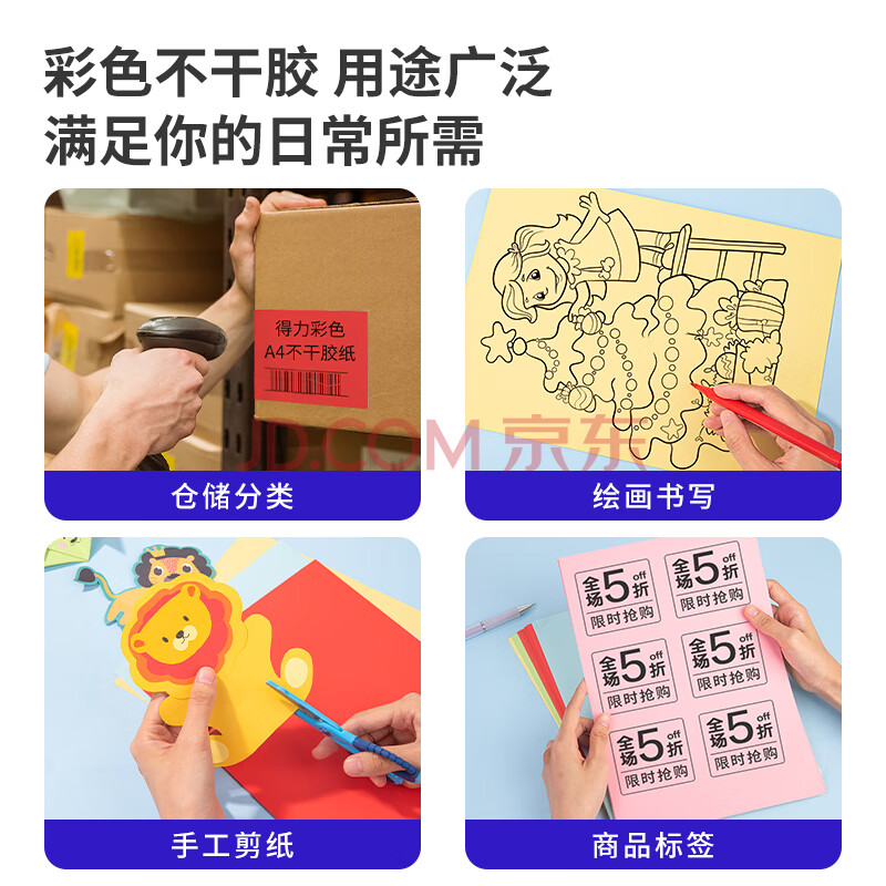 商品相册:得力A4/50张彩色不干胶标贴打印纸 带背胶亚面铜版标签纸 整张无分割 喷墨激光打印机均适用 ZG001第