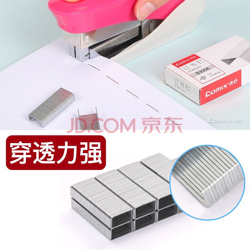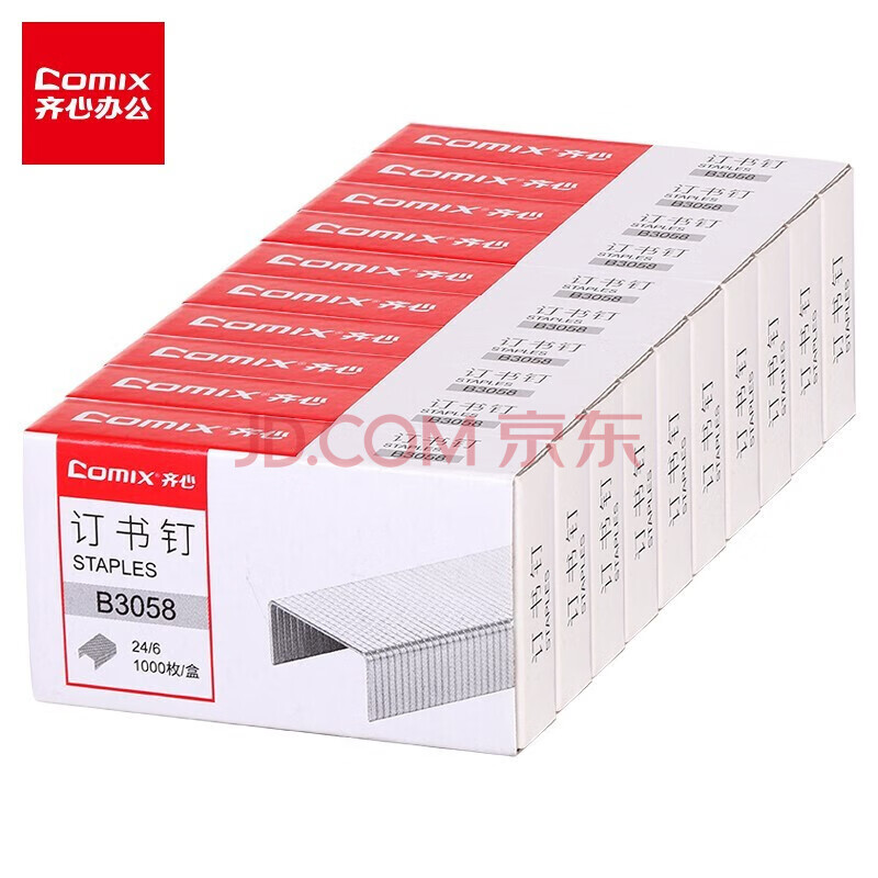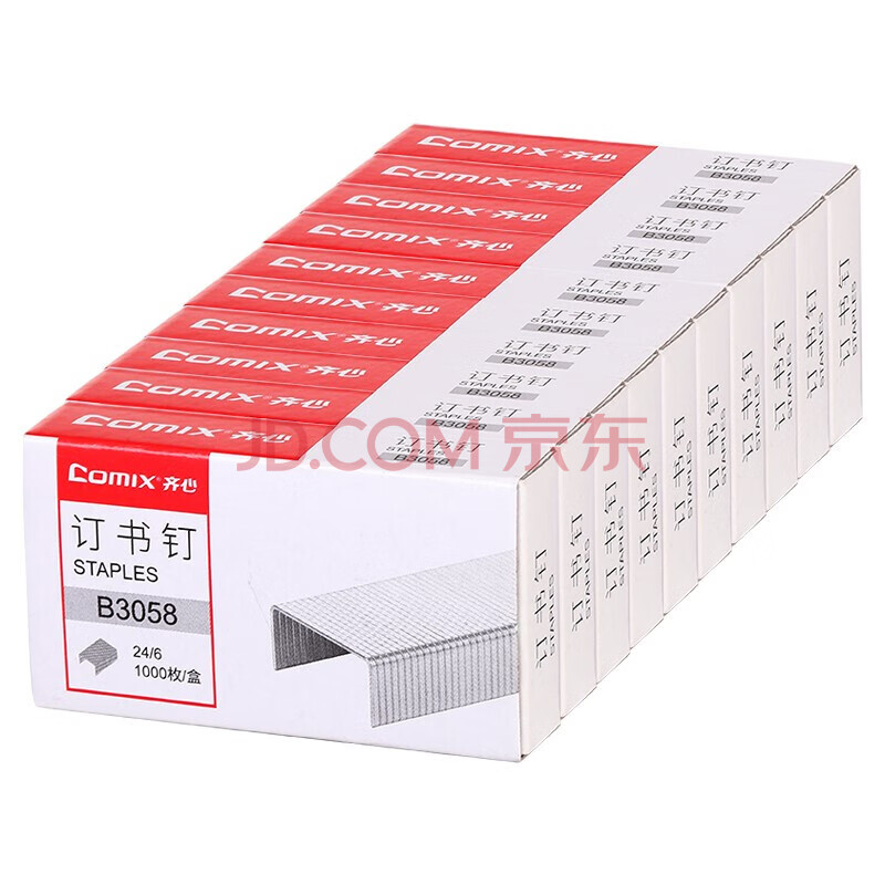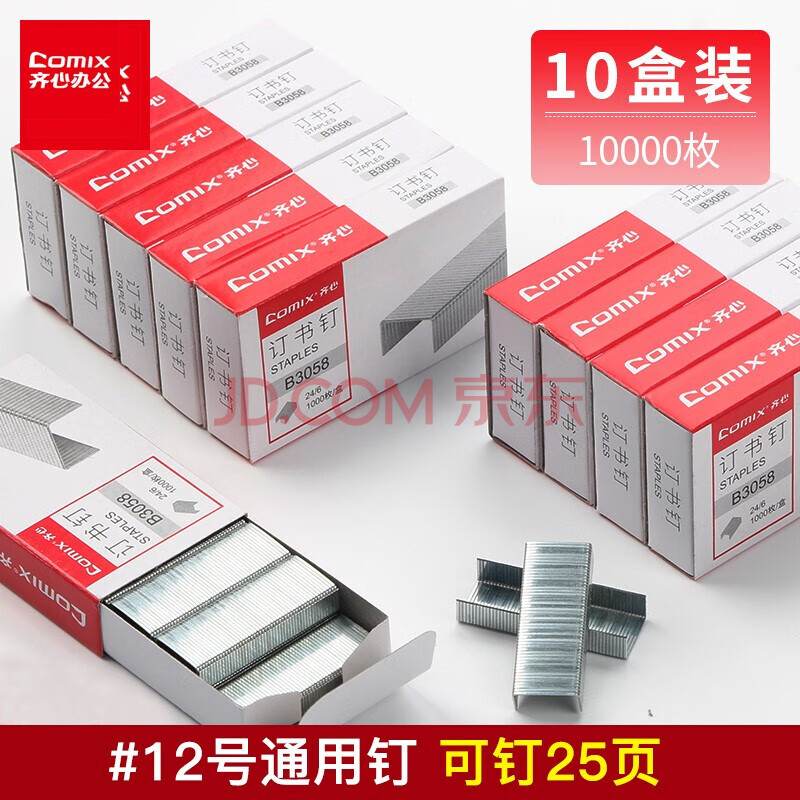 商品相册:齐心(COMIX)优质高强度12#订书钉/统一钉/订书针1000枚/盒 10盒装 办公用品 24/6(可订25页)B3058 第