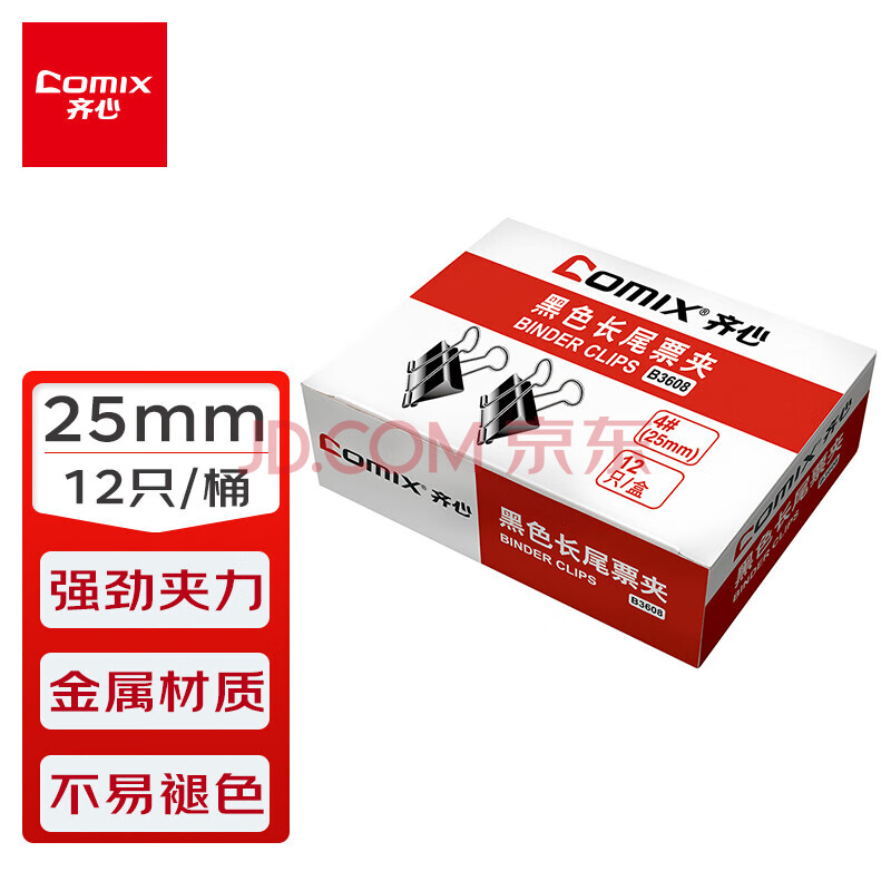 商品相册:齐心(Comix)长尾夹/燕尾夹/票夹 黑色金属 4#25mm 12只/盒 办公用品 工具 B3608第