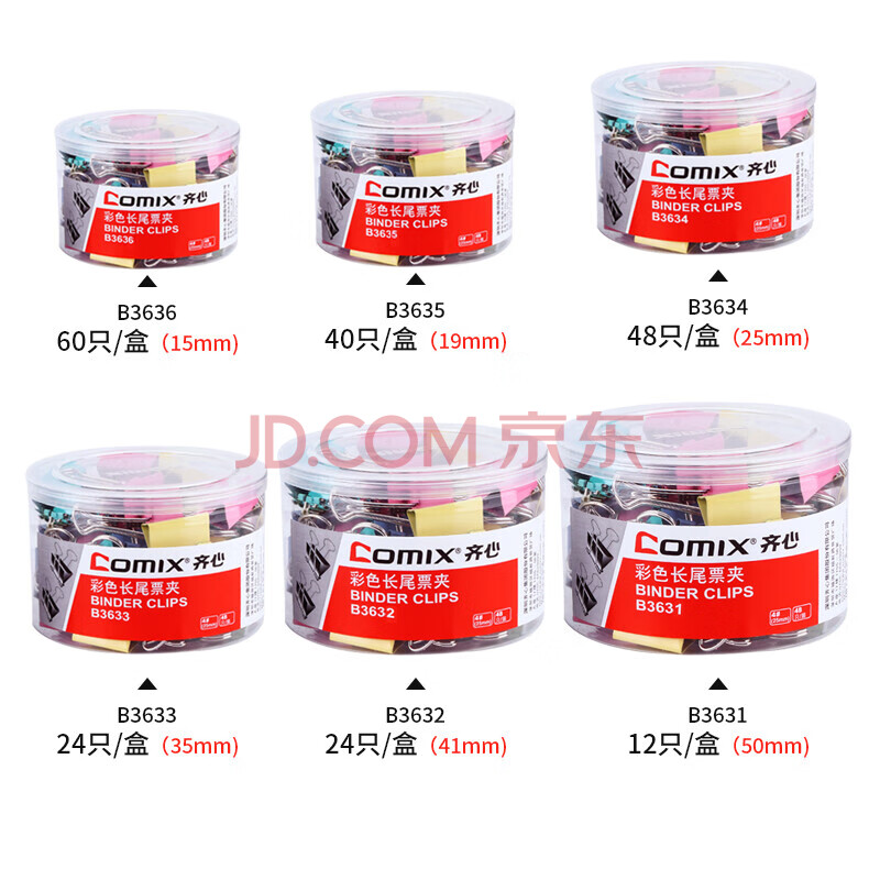 商品相册:齐心(Comix)长尾夹/燕尾夹/票夹 彩色金属 2#41mm 24只/筒 办公用品 工具 B3632第