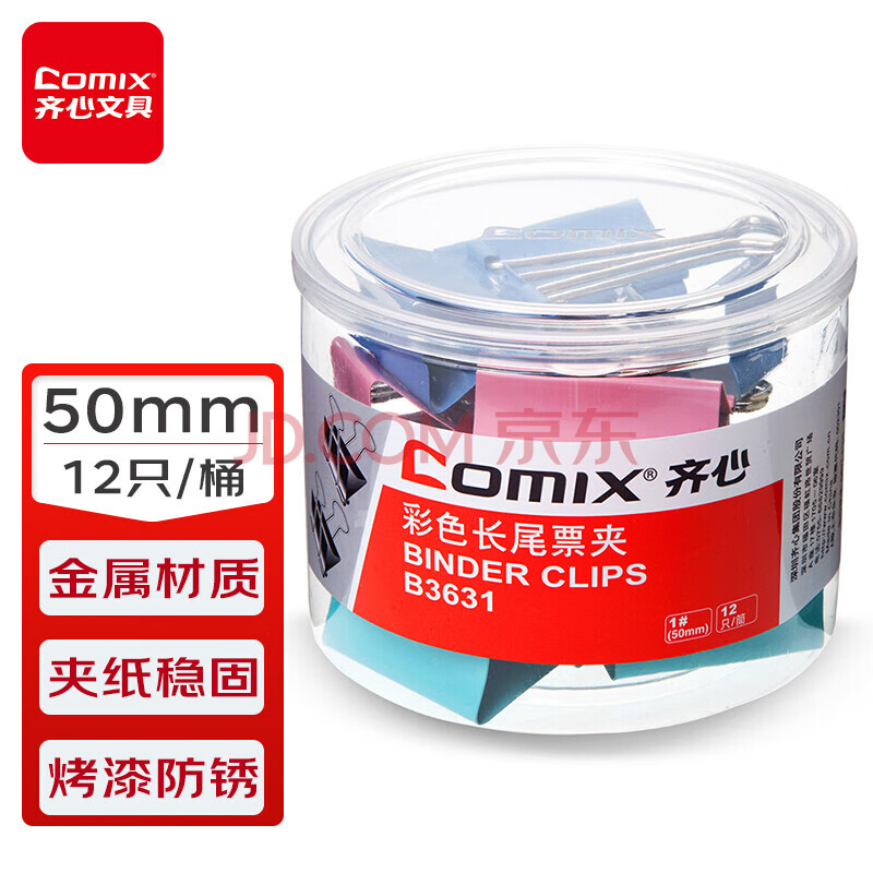 商品相册:齐心(Comix)长尾夹/燕尾夹/票夹 彩色金属 1#50mm 12只/筒 办公用品 工具 拼单/凑单/团购 B3631第