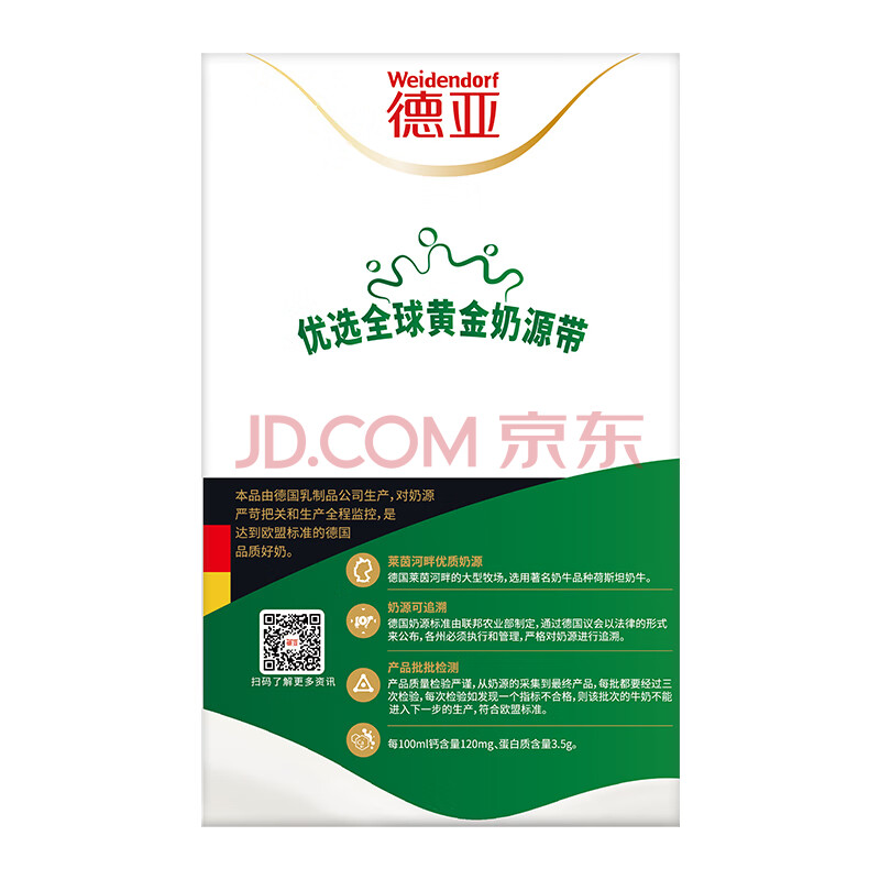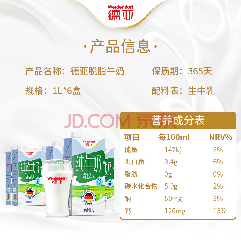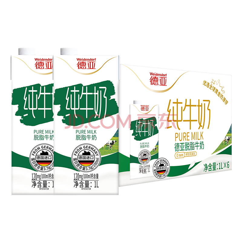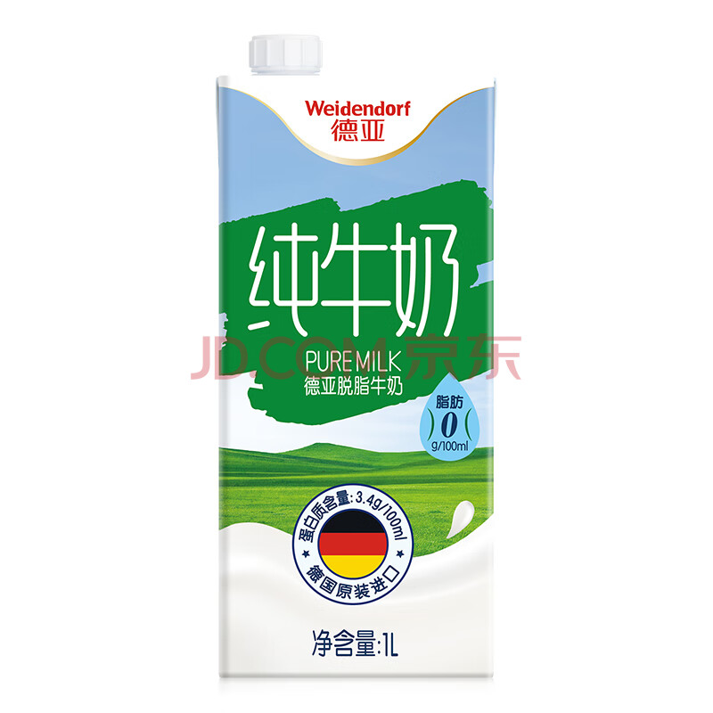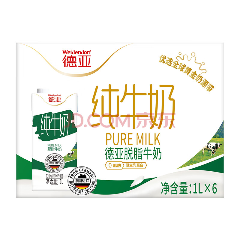 商品相册:德亚(Weidendorf)德国进口脱脂高钙纯牛奶1L*6盒 0脂肪优质乳蛋白学生营养早餐第
