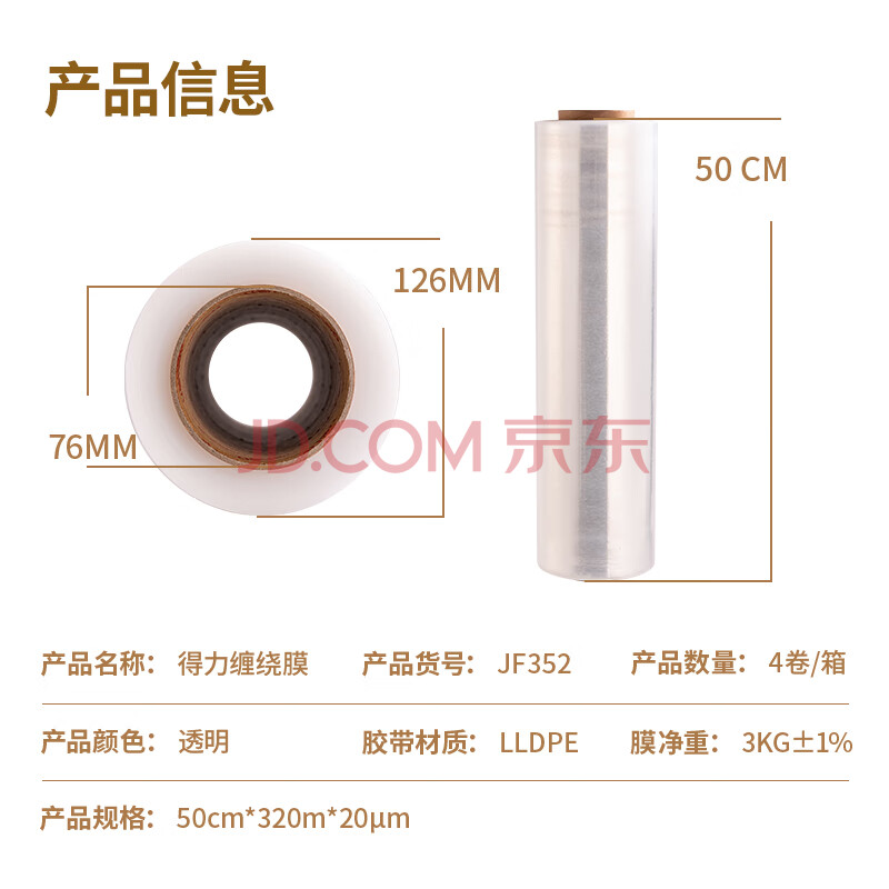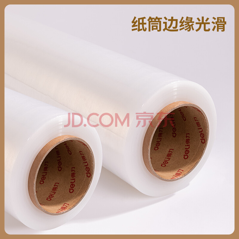 商品相册:得力(deli)缠绕膜工业保鲜膜 打包膜包装膜拉伸膜 搬家自粘性pe保护防水膜50cm宽 320m长 JF352 4卷/箱第
