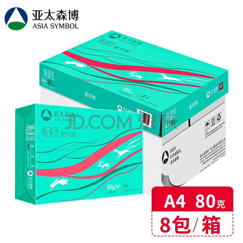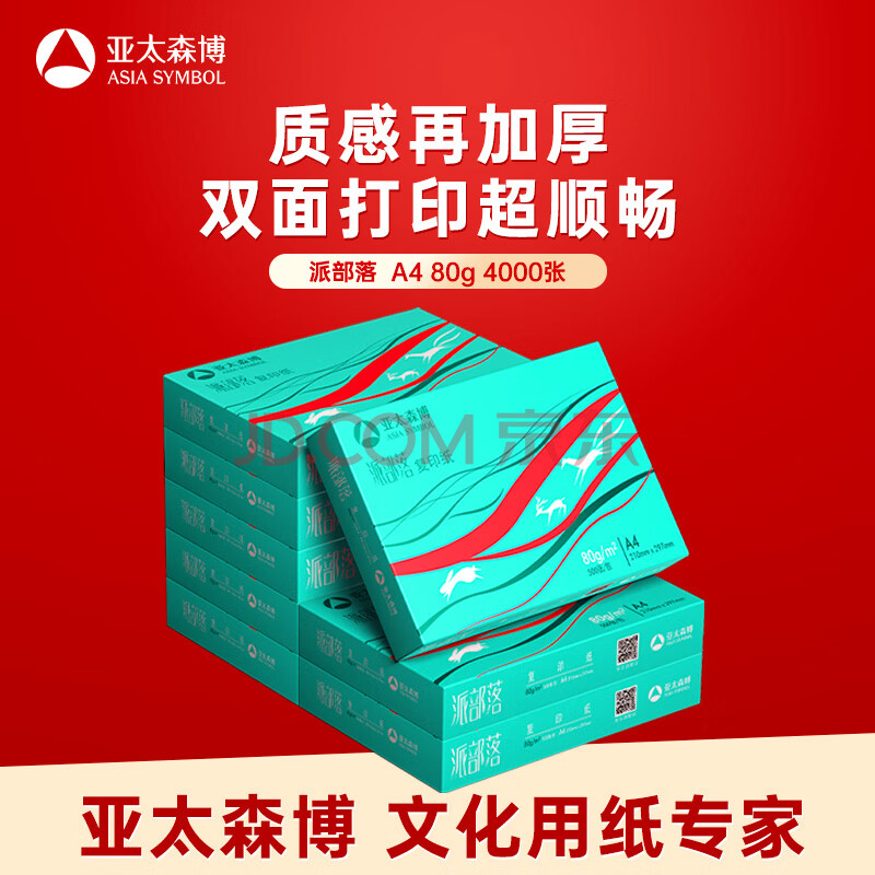 商品相册:亚太森博派部落A4打印纸 80g 500张*8包 不卡纸 双面复印纸高性价比 整箱4000张【专业造纸厂牌】第