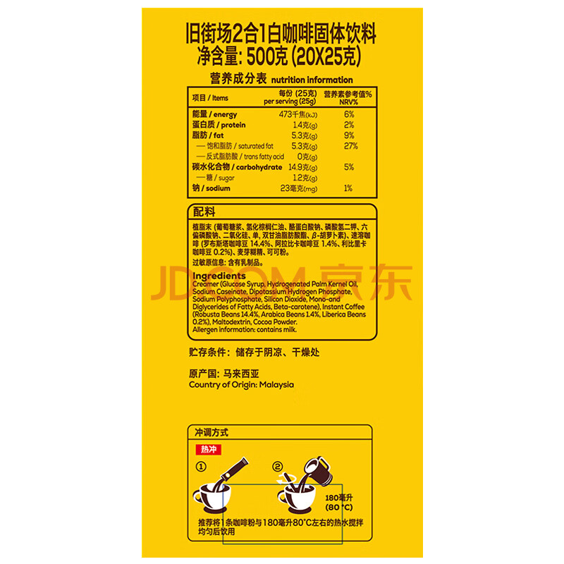 商品相册:旧街场(OLDTOWN)速溶原味白咖啡无蔗糖马来西亚进口二合一咖啡粉25g*20条中度焙炒第