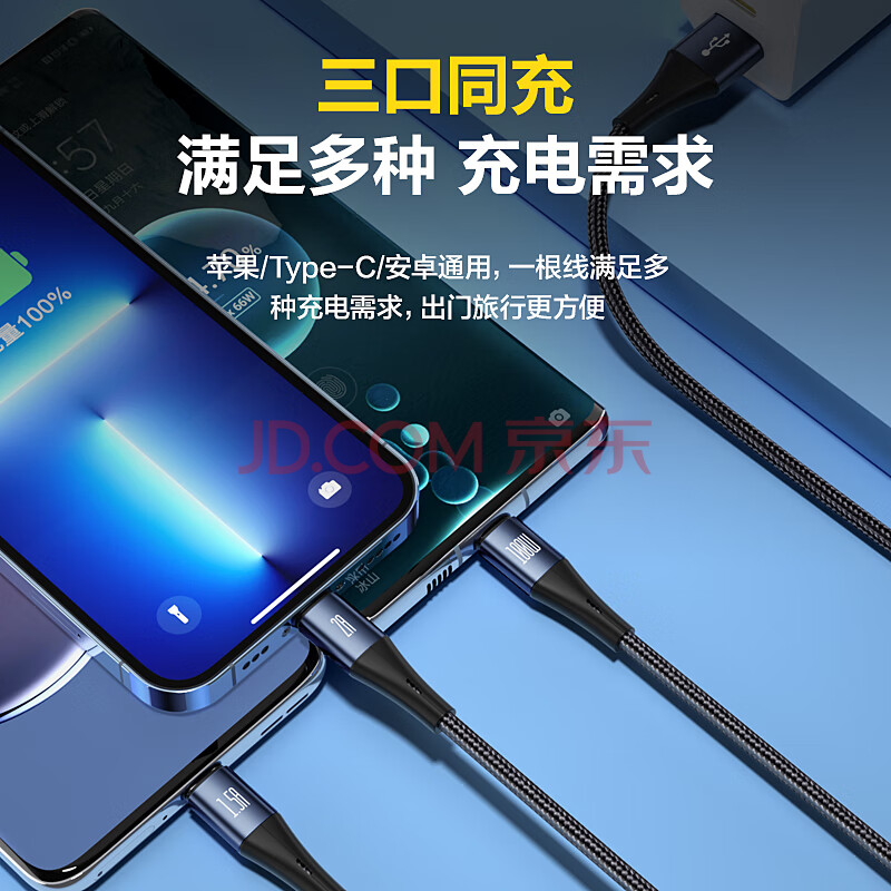商品相册:品胜充电线三合一数据线6a/5a快充100W/66W一拖三线适用苹果17/16/14华为Mate80pro/P70小米15手机车载第